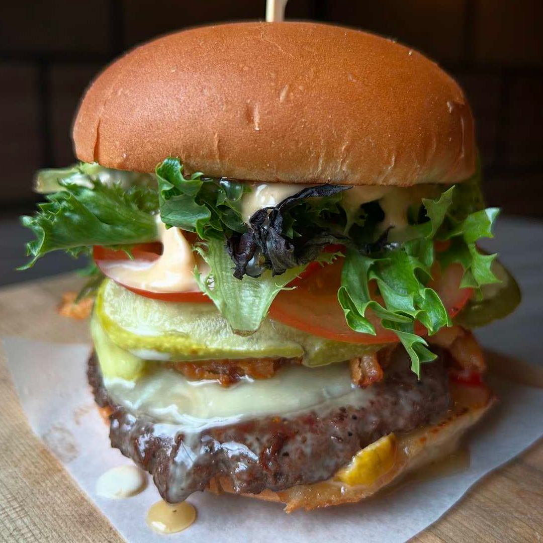 Smash Patty, Provolone, Sriracha Mayo, Crispy Onions, Lettuce, Tomato, Banana Peppers, Bun Slapper Pickles, Hot Honey Aioli, Toasted Brioche Bun.