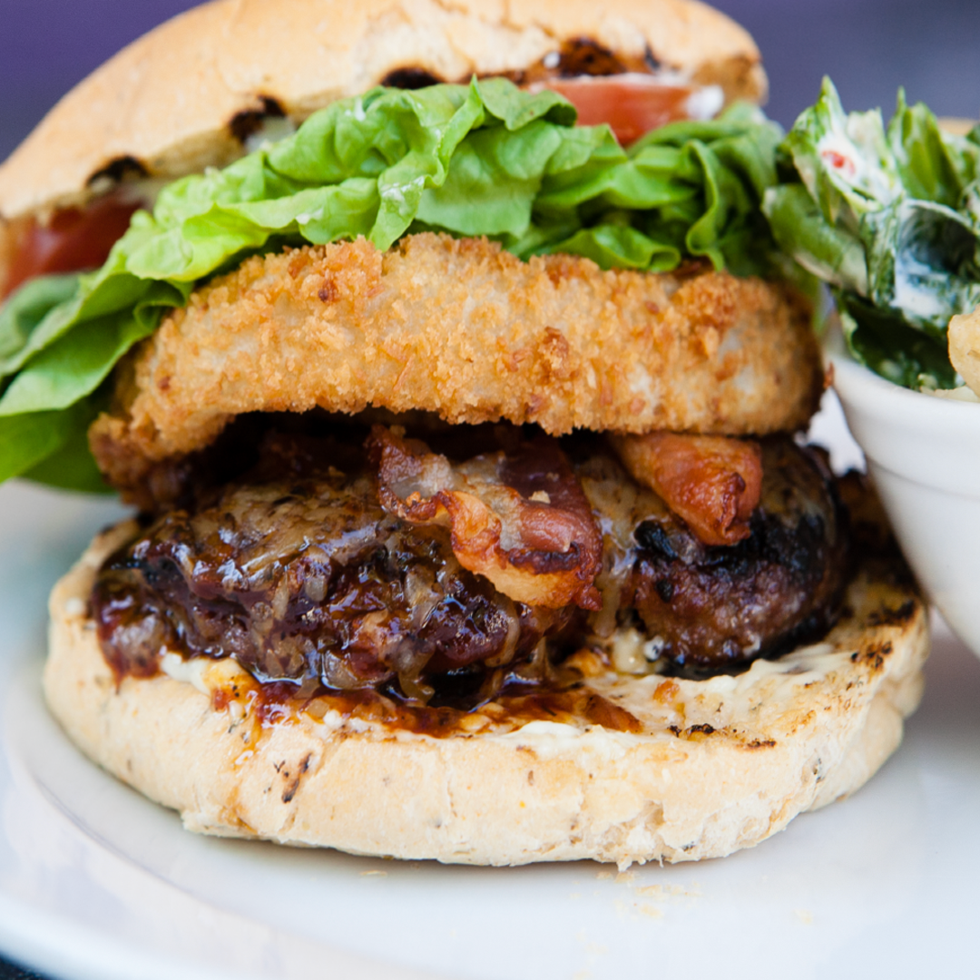 A 6oz Certified Angus Beef Burger brushed with Our Signature Guinness BBQ Sauce, Aged Guinness Cheddar, Maple Smoked Bacon, Two Hand-Cut Coconut Onion Rings, Lettuce, Tomato and Garlic Aioli served on a Tomato Basil Kaiser.