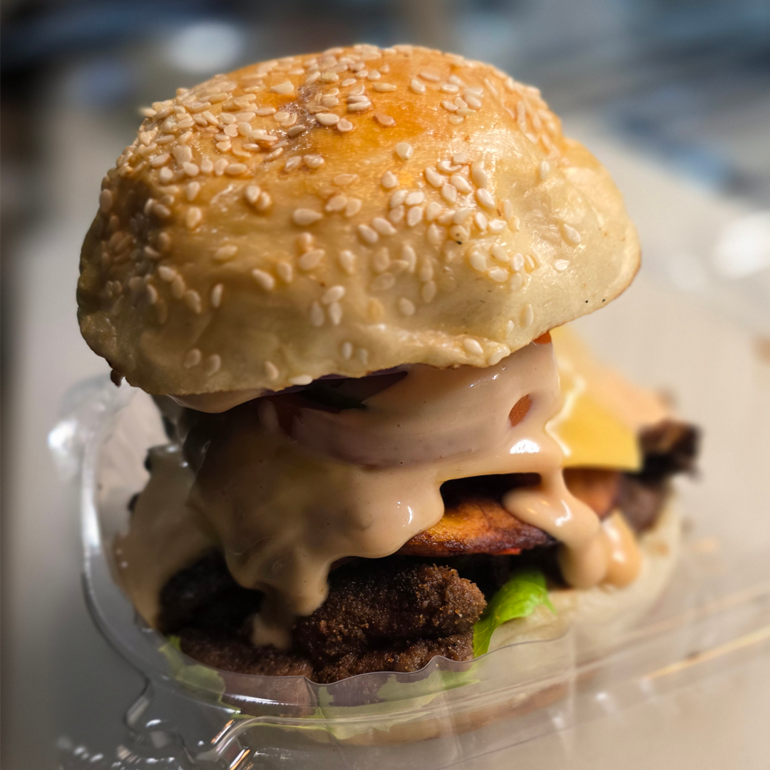 Shredded Canadian Beef Suya, Veggies, and our famous House Sauce served on an Agege Bread Bun.