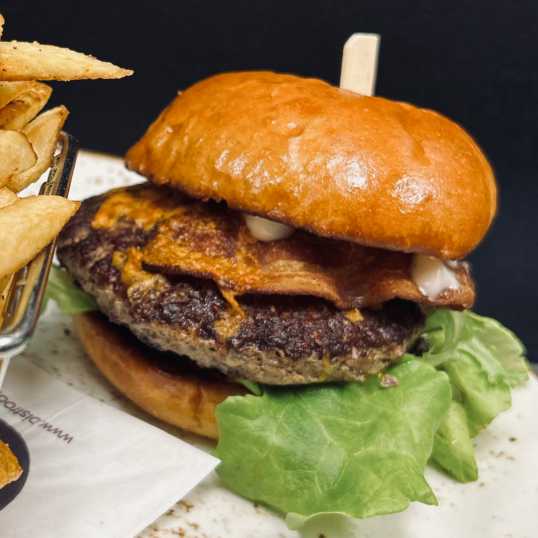 Ontario Beef Patty, Bacon, Cheddar Cheese, Lettuce, Tomato, Garlic Aioli on a Brioche Bun served with Fries.