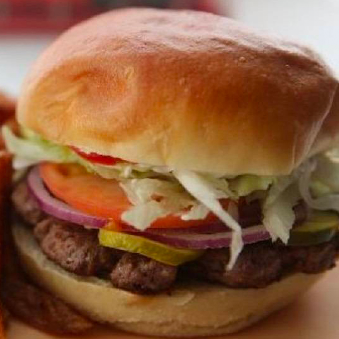 A 6oz 100% Canadian Beef Patty, Fresh Lettuce, Tomato, Onions, Pickle, Ketchup and Mayo served on an Ace Bakery Bun.