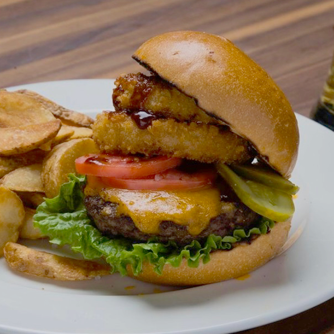 Classic Cheeseburger with Melty Cheese and a Crunchy Deep-Fried Pickle on top.
