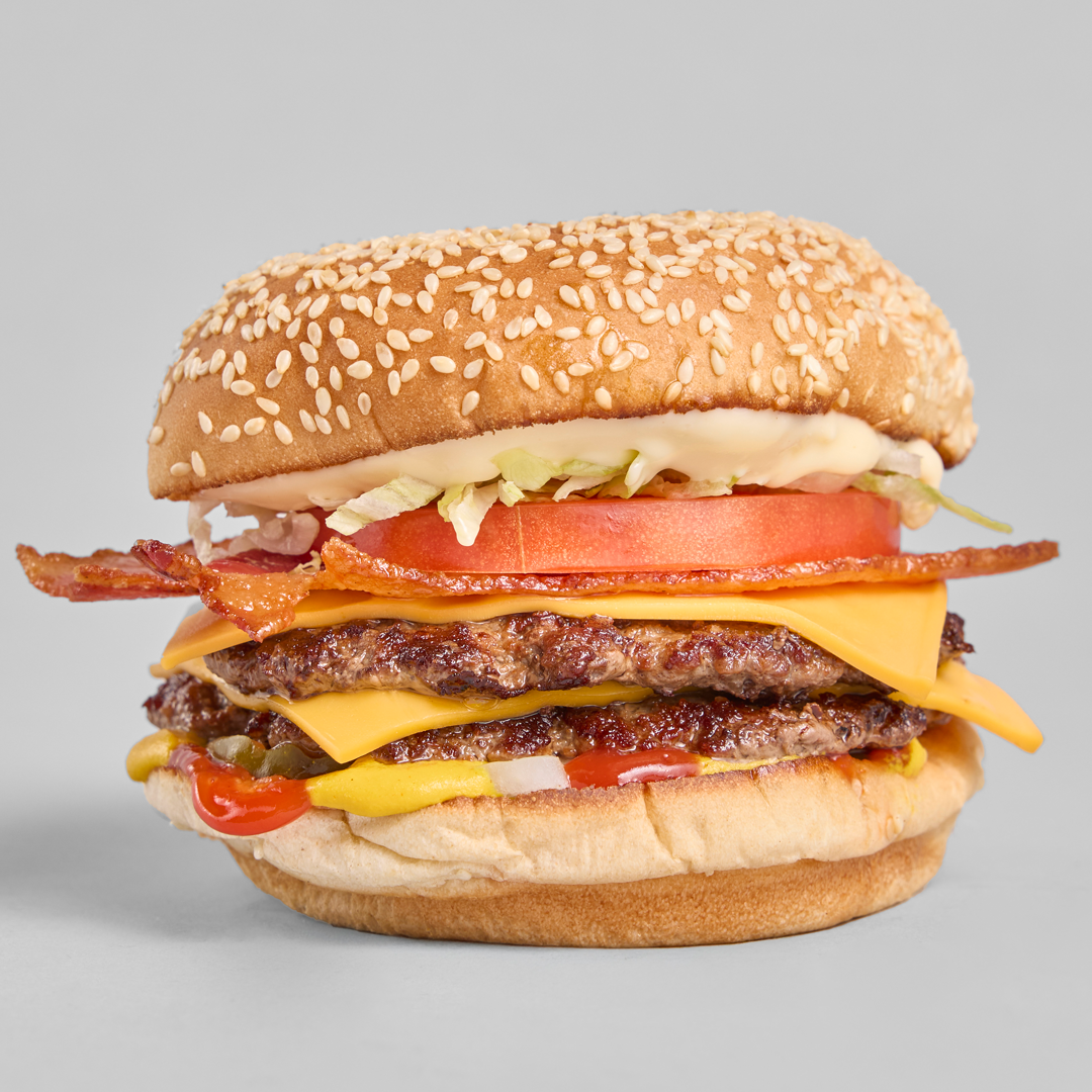 Double Local Beef Patty, Bacon, Cheese, Mustard, Ketchup, Aioli, Onion, Pickles, Lettuce, Tomato, Sesame Seed Bun.