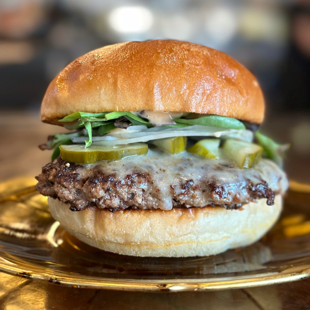 A Blended Prime Rib Beef & Pork Belly Patty, Cheddar Cheese, Lettuce, Onion, Pickles, and Special Sauce.