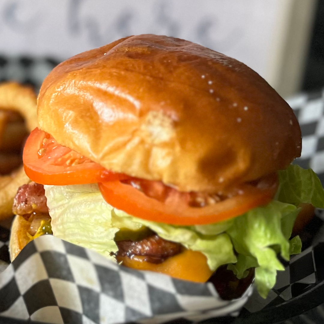 6oz perfectly seasoned All Canadian Beef Patty, Lettuce, Tomato, Pickle and Onion.