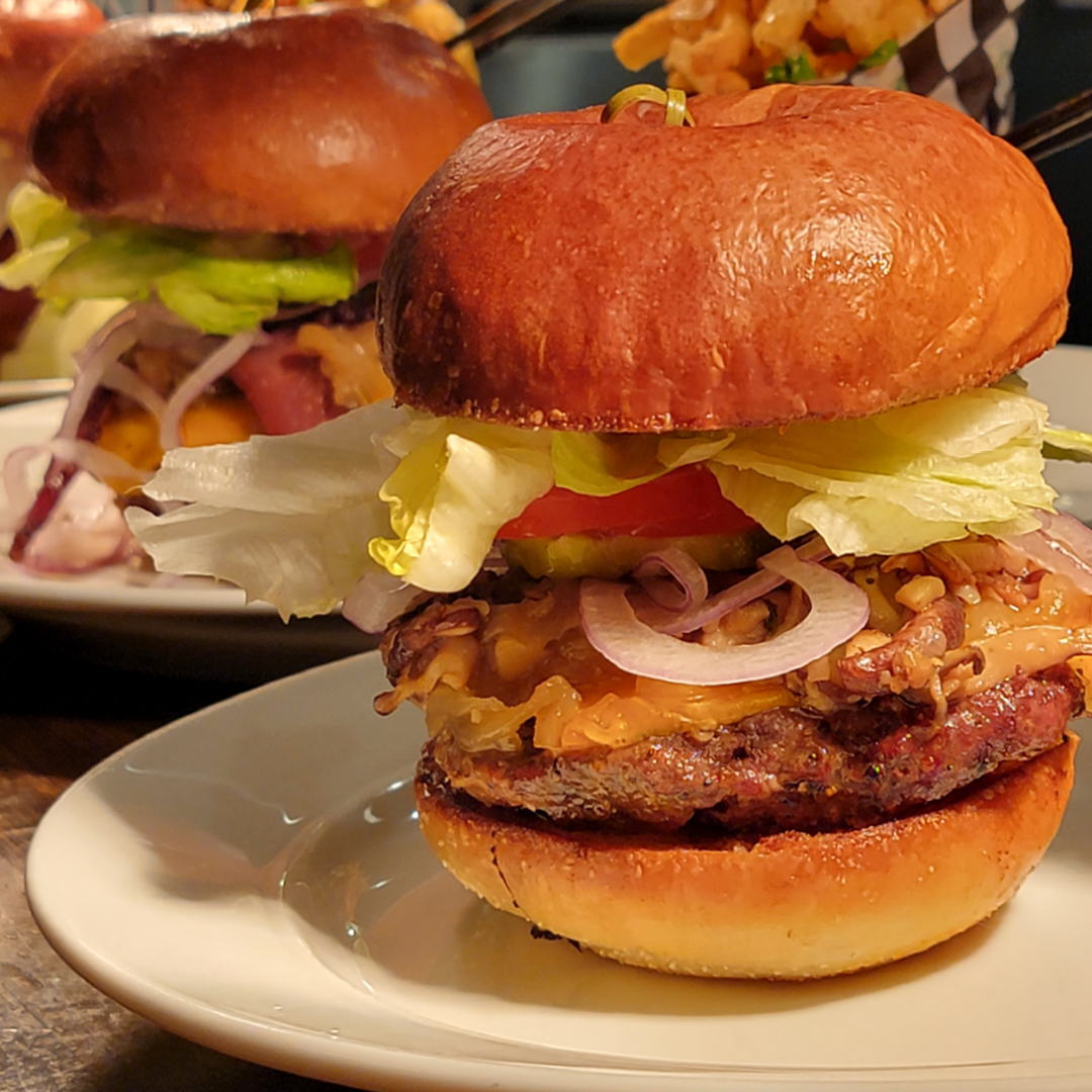 A Chuck and Brisket Burger Patty, House-Made Fancy Sauce, Lettuce, Tomato, and Pickles served on a Toasted Brioche Bun.