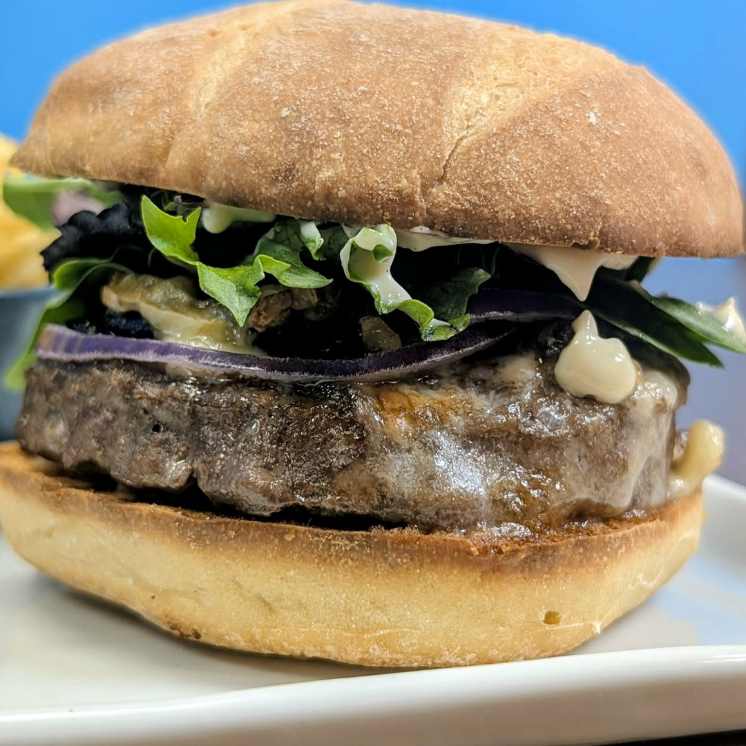 A House-Made Meatloaf Burger topped with Melted Brie, Cherry Chutney, Sliced Red Onion, Spring Mix, Dijon Aioli and served with a side of Warm Kettle Chips.