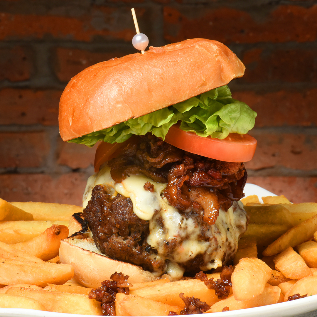 Our Secret Recipe Hand-Pressed Burger Patty, Bacon Strips, House-Made Maple Bacon Jam, Empire Cheese Whiskey Mustard Cheddar Cheese, Lettuce and Tomato served on a Toasted Bun.