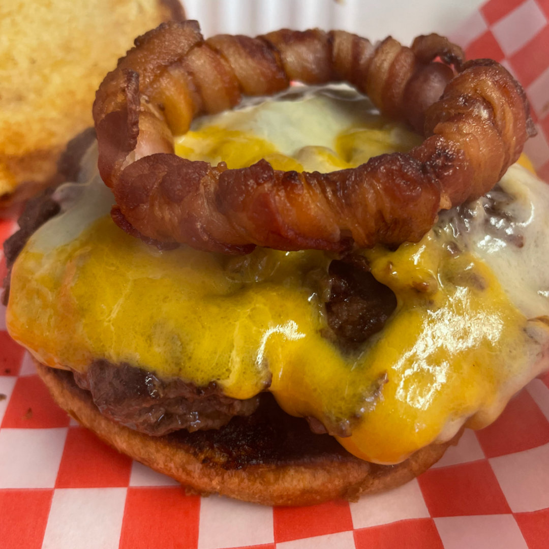 A 6oz Chuck-Blend Canadian Beef Patty, Sautéed Onions, Candied Bacon, Cheese, and a Bacon-Wrapped Onion Ring (no breading) served on a Toasted Bun.