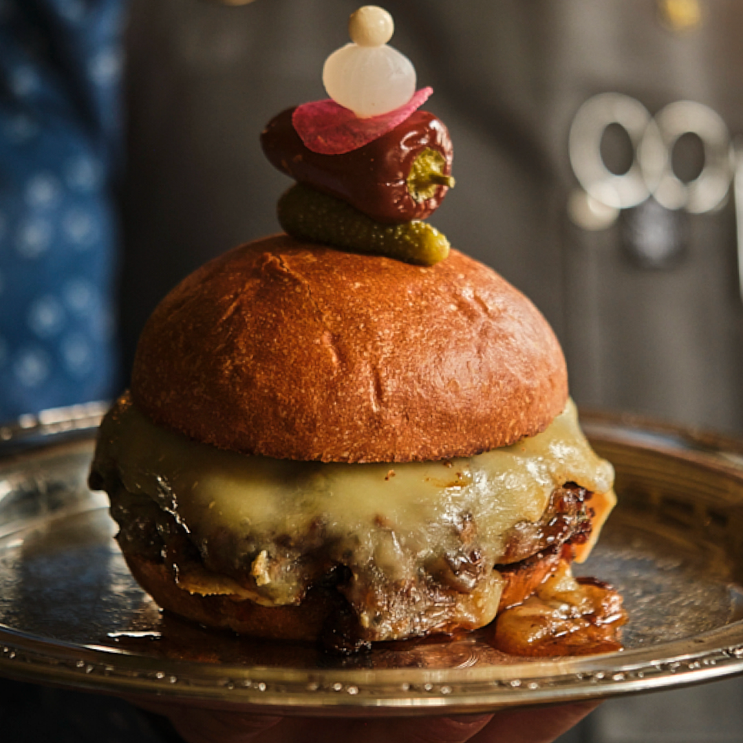 A Pan-Roasted Chuck and Brisket Patty, Bacon Molasses Compote, Smoked Mont Jacob Cheese and Worcestershire Mayo served on a Toasted Bun and topped with a Gherkin Pickle, Red Pepper and Cocktail Onion Garnish.