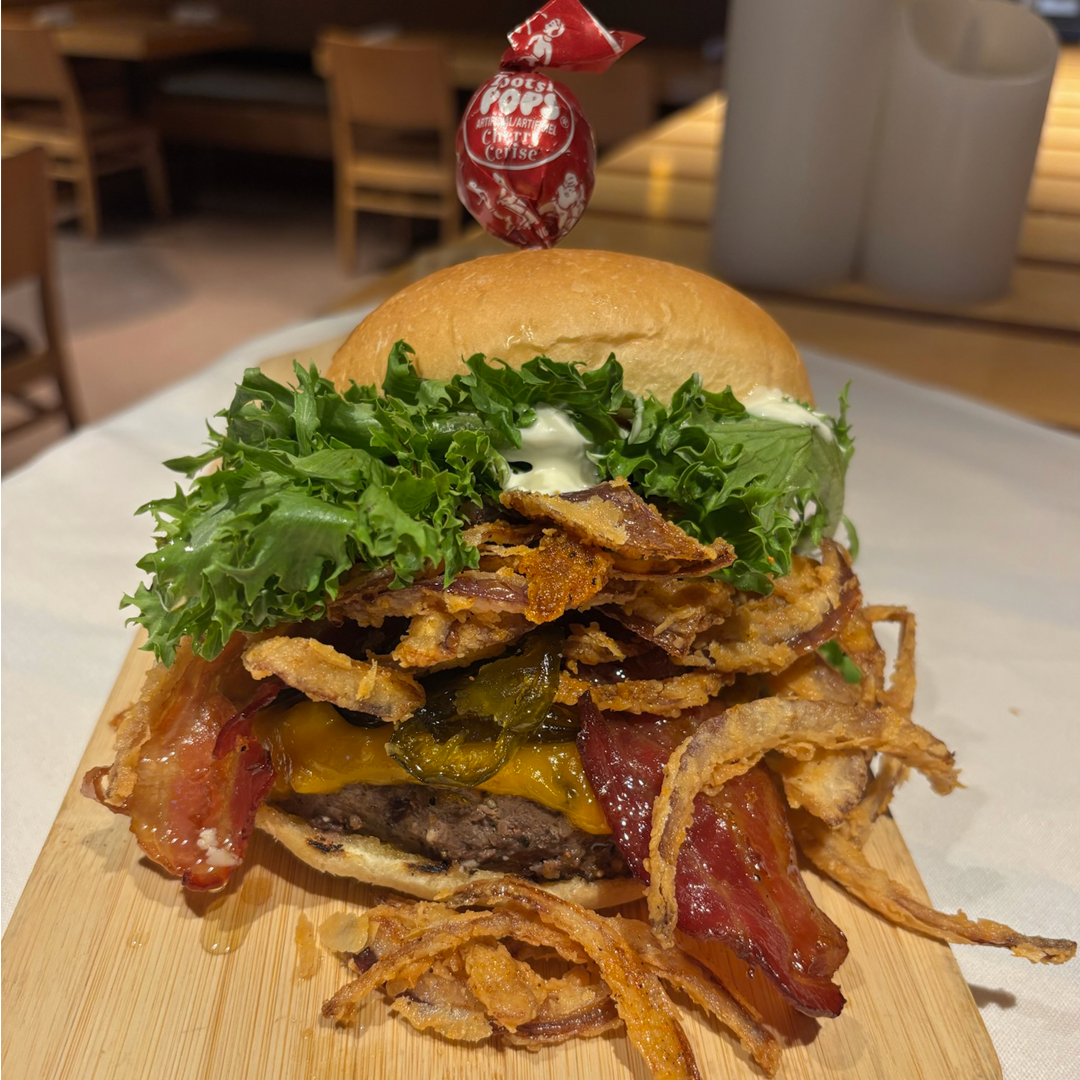 6oz Beef Patty on a Brioche Bun, ADL Cheddar, Candied JalapeƱo, Maple Bacon, Crisp Sweet Onion, Dijon Maple Mayo. Sucker Topper.