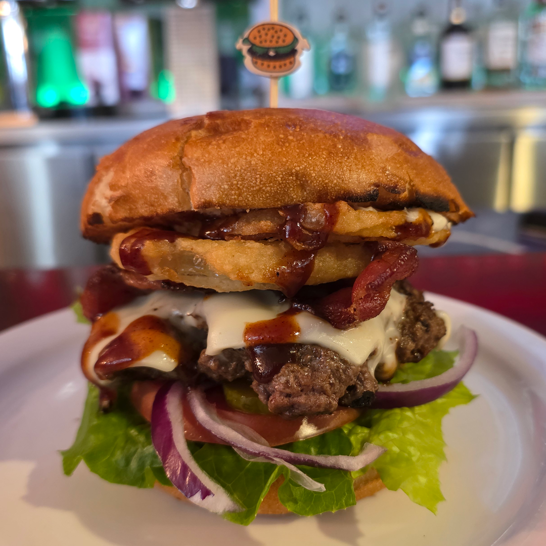 6oz Island Beef Patty topped with Mozzarella Cheese, Smokey BBQ, Cripsy Fried Onion Ring, Bacon, Mayo, Lettuce, Red Onion, Tomato & Pickles.