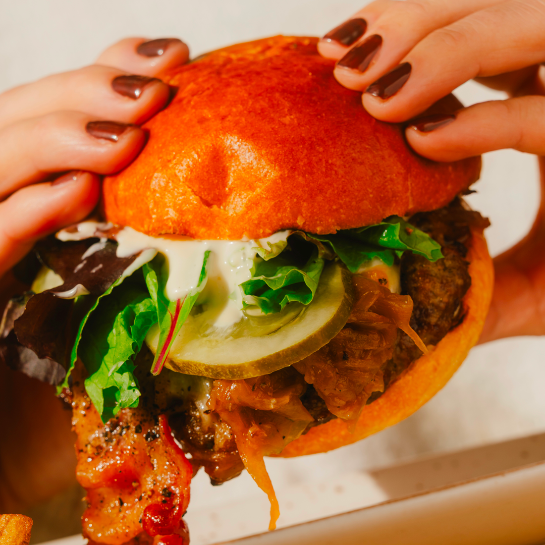 6oz Island Beef Patty, Lettuce, Pickles, Peppercorn Bacon, Smoked Gouda, Caramelized Onions, Roasted Garlic Aioli, Toasted Bun.