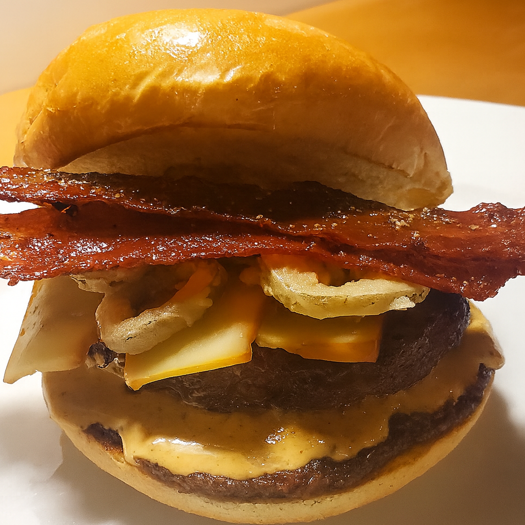 6oz Canadian Beef Patty on a Toasted Brioche Bun, topped with Smoked Cheddar, Maple-Pepper Bacon, Crispy JalapeƱo Rings, Tomato Bacon Jam, and Spicy Mustard Mayo, Finished with a touch of Maple on the Crown Bun.