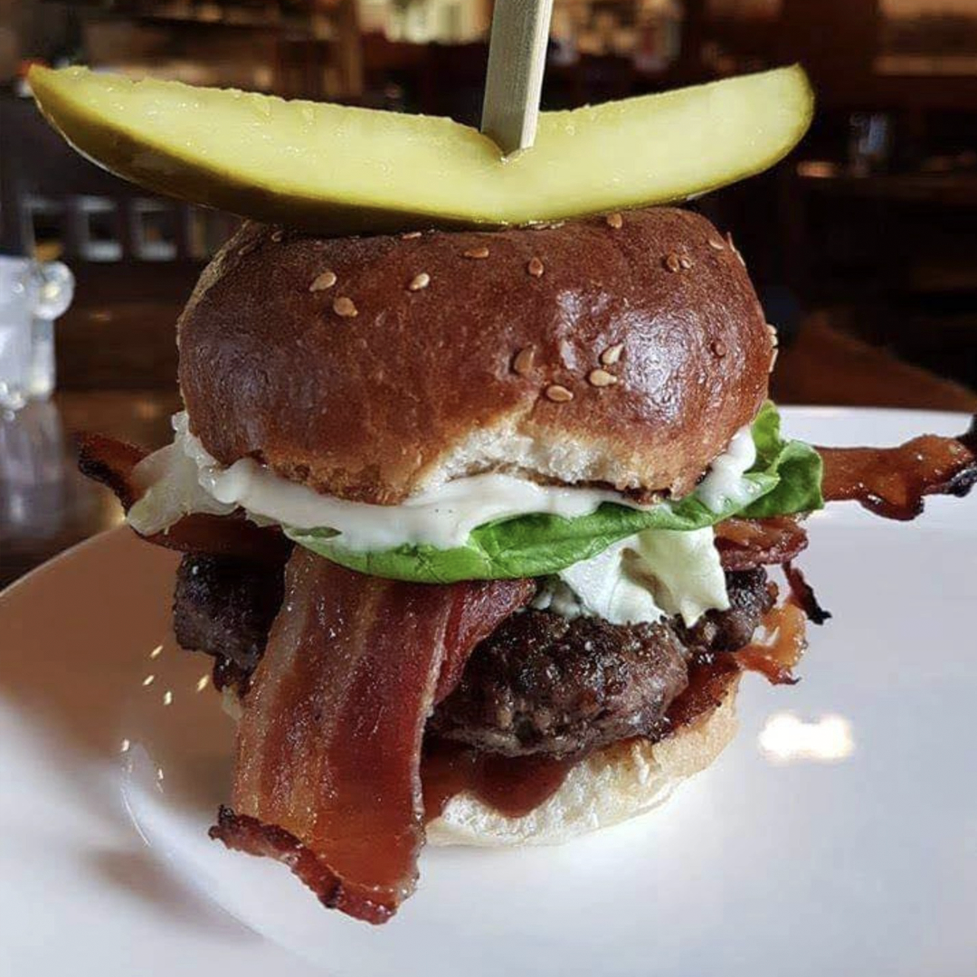 A Speckle Park All-Beef Patty, Blackening Spice, Maple Bacon, Bleu Cheese, Cranberry-Chipotle BBQ Sauce, Roasted Garlic Aioli, Onion Jam, Butter Lettuce, and Tomato, served on a House-Baked Sesame Brioche Bun.