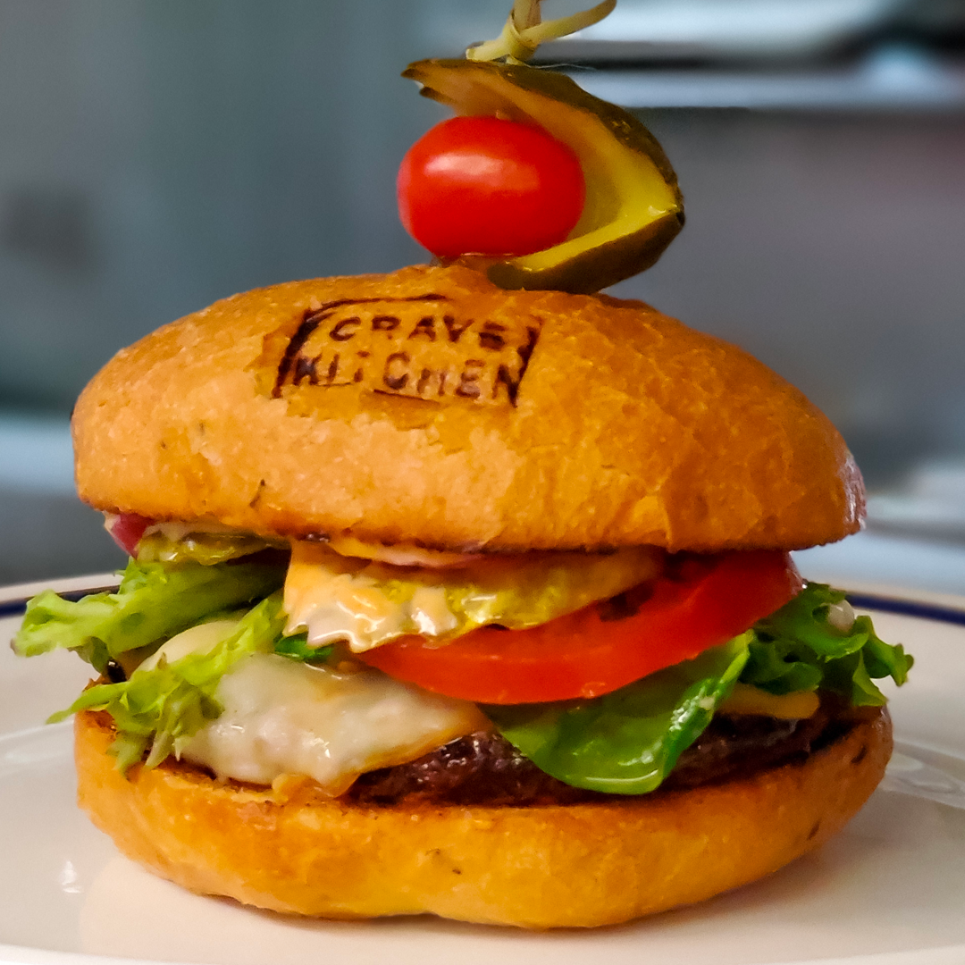 Box H Farm Grass Fed Beef Burger, Braised Box H Shortrib, Le Guyere A.O.P, Beef Bacon + Smoked Onion Marmalade, Chorizo Mayo, House Made Pickles and Loaded Focaccia Bun.