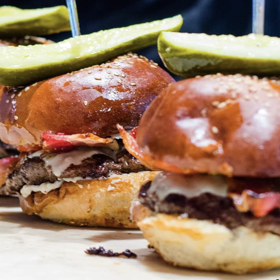 A Speckle Park All-Beef Patty, Maple Bacon, Aged Cheddar, Butter Lettuce, Tomato, Pickled Onions, Roasted Garlic Aioli, and Harvest Sauce served on a Sesame House-Baked Brioche Bun.
