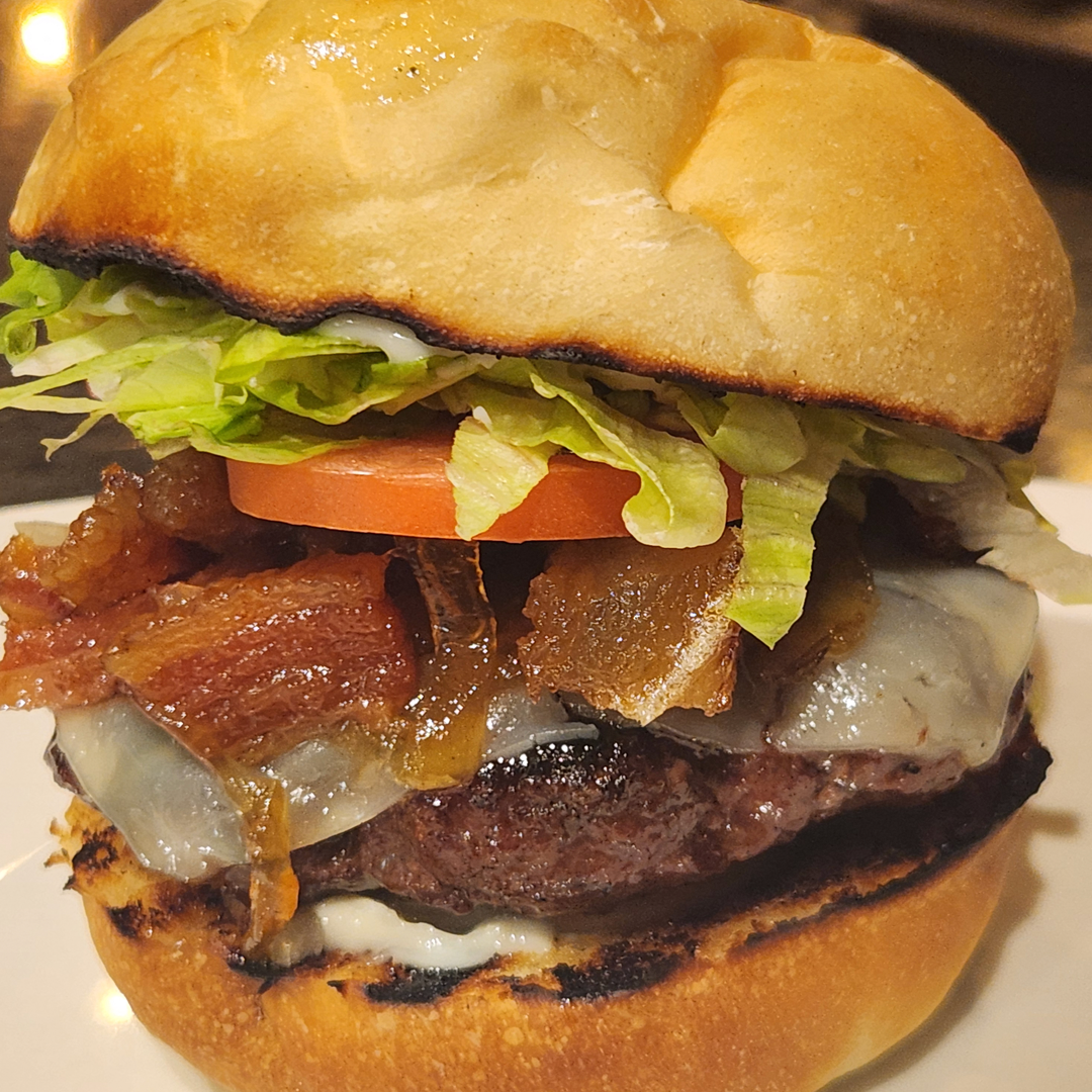 6oz House-Made Patty with Local Beef. Topped with House-Made Bacon Jam, Made With Drake Bacon, White Cheddar, Onion, Tomato and Shredded Lettuce on a Garlic Buttered House-Made Brioche Bun.