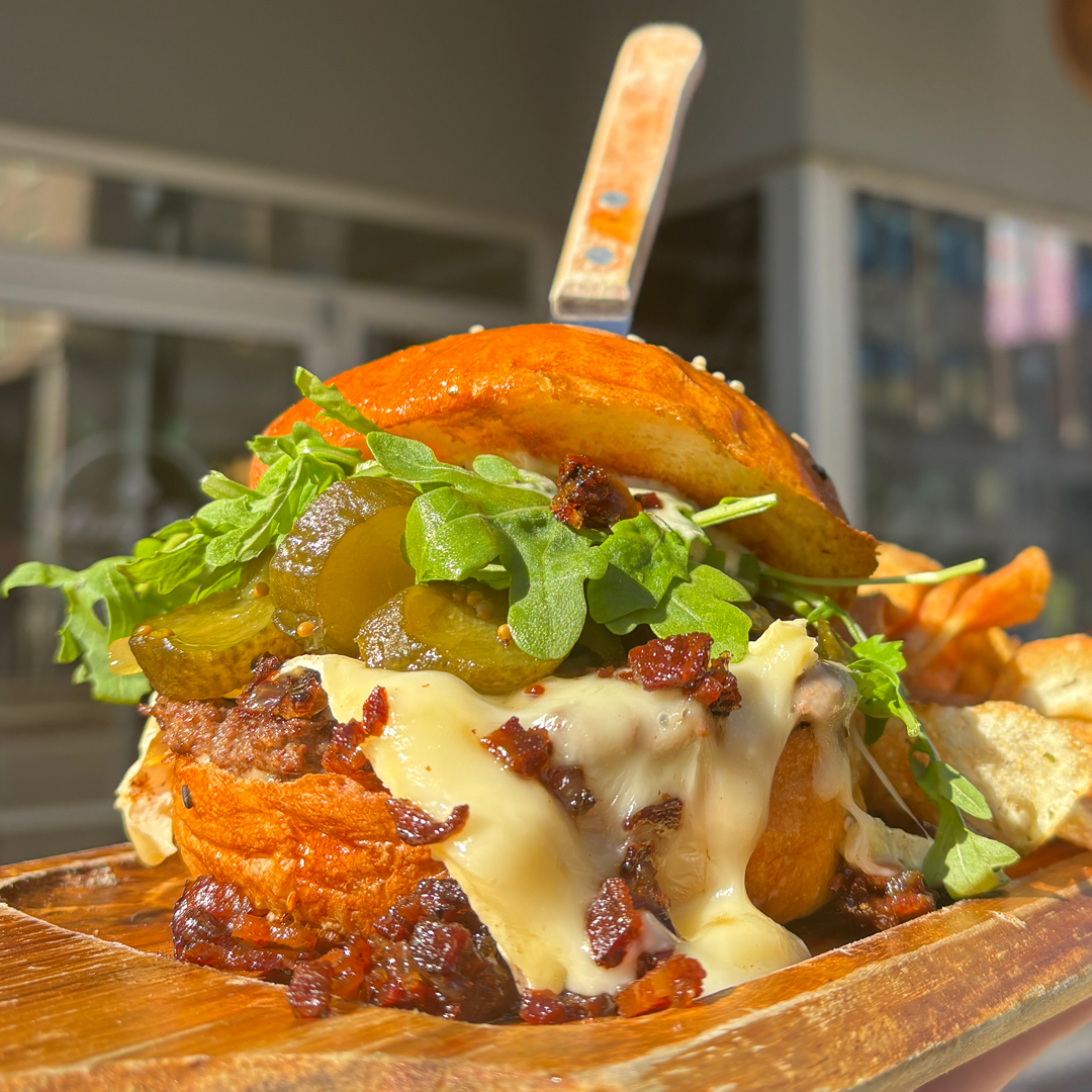 Smash Patty on a Sesame Seed Brioche Bun with Bacon Jam, Brie, Garlic Aioli, Bread and Butter Pickles and Arugula.
