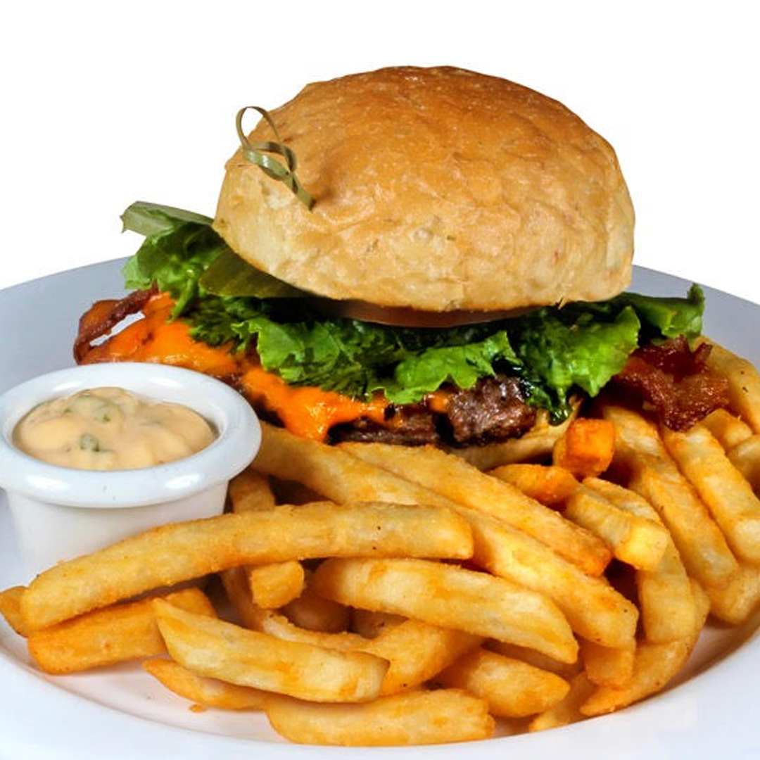 A Canadian Beef Patty, Bacon, Lettuce, Tomato, Caramelized Onions, Pickles, Smoky Mayo and Cheddar Cheese served on a Toasted Bun.