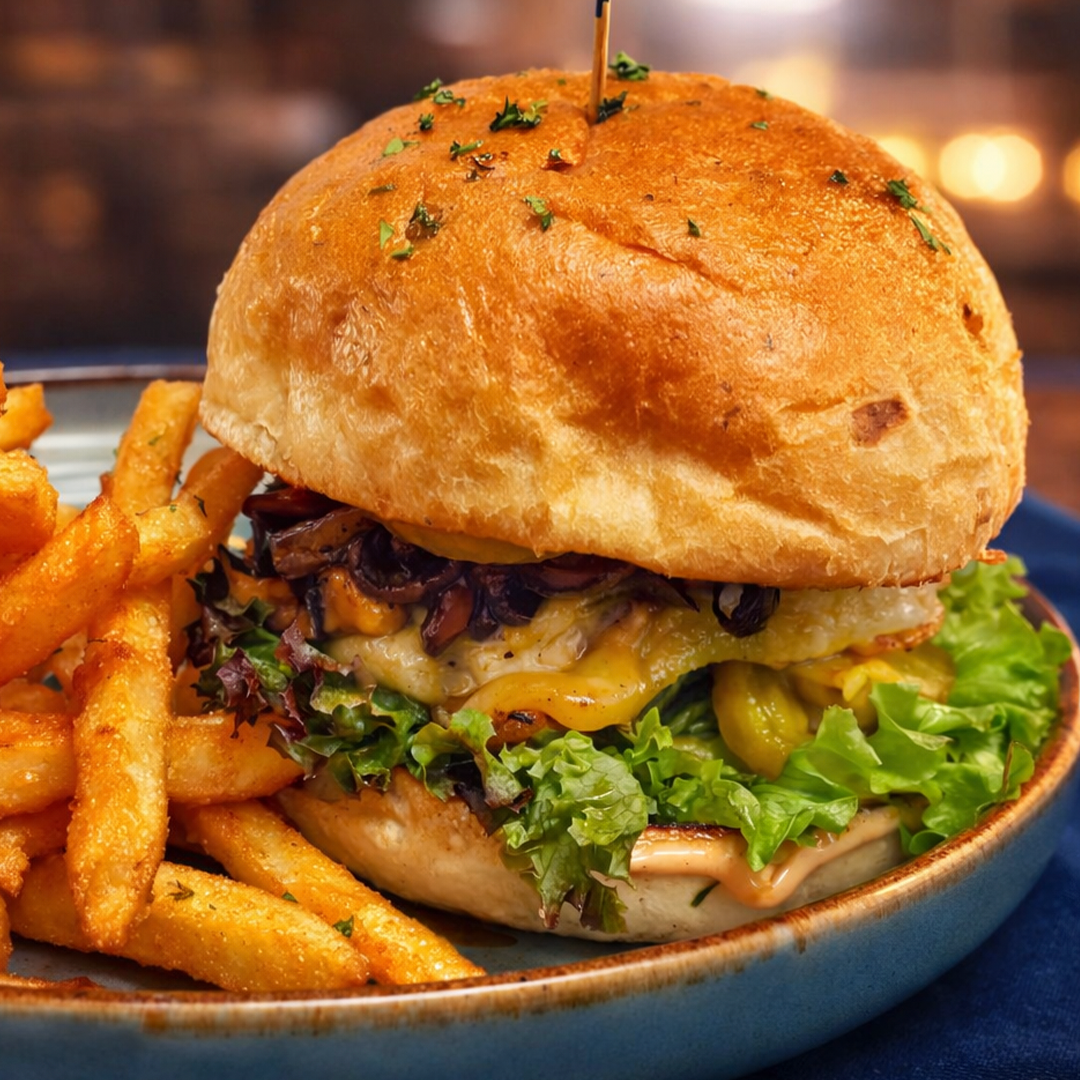 Juicy, perfectly grilled Beef Patty, Sautéed Mushrooms, Melted Swiss Cheese finished on a soft, buttery Potato Scallion Bun.