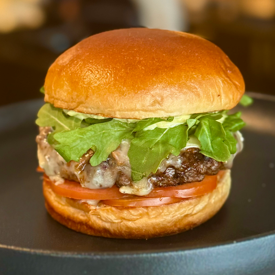 A Fresh Canadian Chuck Ground Beef Patty topped with Brie Cheese, Bacon Jam, Arugula, Tomato and Signature Sauce served on a Toasted Bun.
